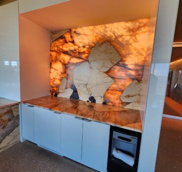 Designed for a high-traffic communal zone, this kitchen display and coffee station installation at Nexus Way combines style with resilience. The Satin Tuffskin overlay enhances the stone’s natural appeal while offering superior stain and heat resistance. Ideal for daily use in shared spaces where durability and visual warmth are essential.
